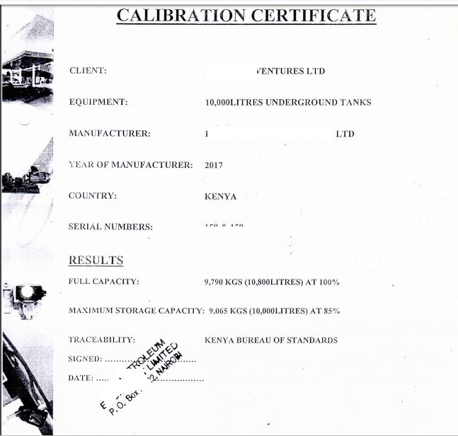 Certificate of calibration for the LPG tank (copy)
